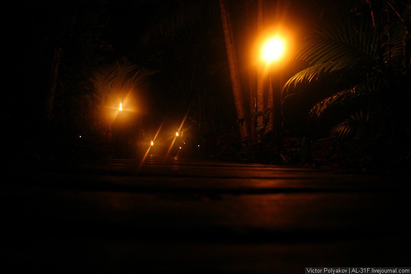Вдоль «тропинок» зажигаются факелы, и люди расходятся по своим шалашам — время спать.