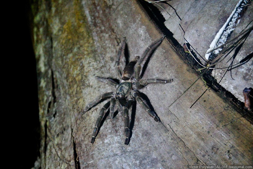 Австралиец Рон, который, как выяснилось, путешествует по Южной Америке уже больше года, решил здесь остаться на месяц в качестве волонтера, рассказывать туристам о местных красотах, изучать природу и ждать своего самолета в Европу, показал нам, где живут паучки. Оказывается, в одной из пальм (как минимум в одной:) ), стоящей прямо по центру лагеря, живут такие вот замечательные создания, размером с ладошку.