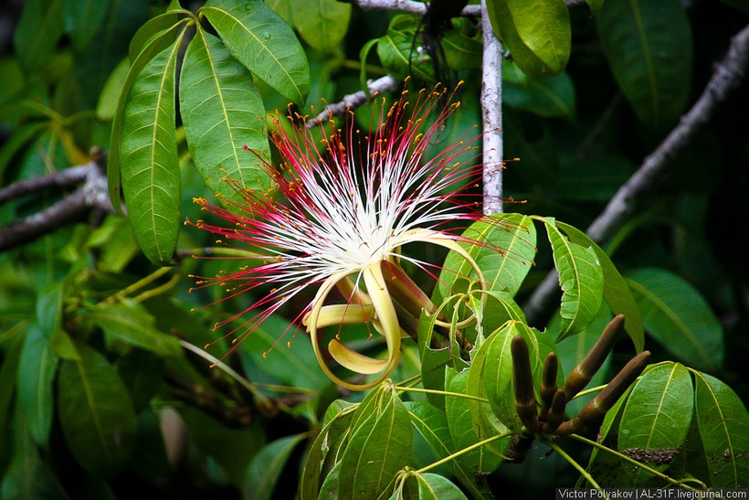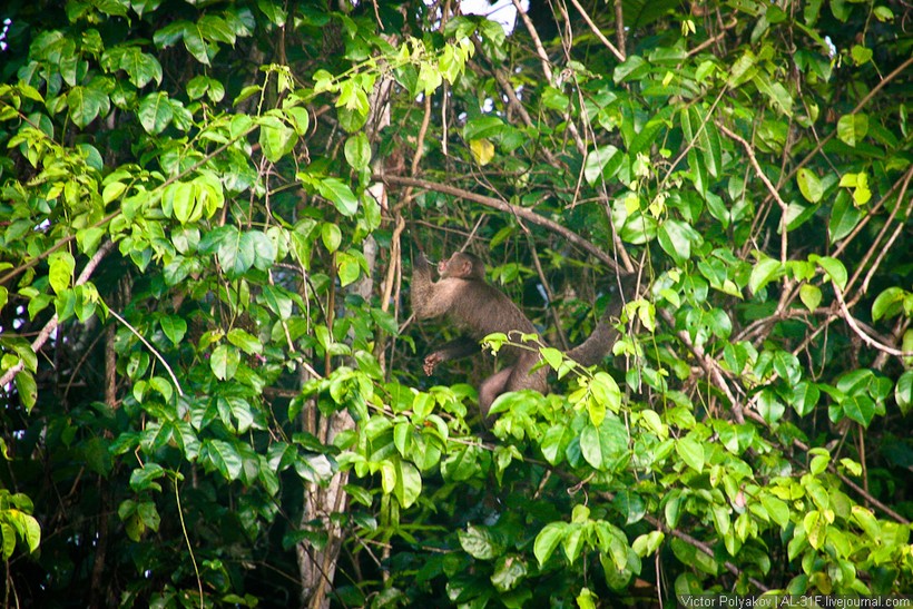 По деревьям прыгают обезьяны. Их очень тяжело заметить. Только поутру на рассвете, когда джунгли просыпаются, они весело скачут по ветками и с интересом наблюдают за туристами.