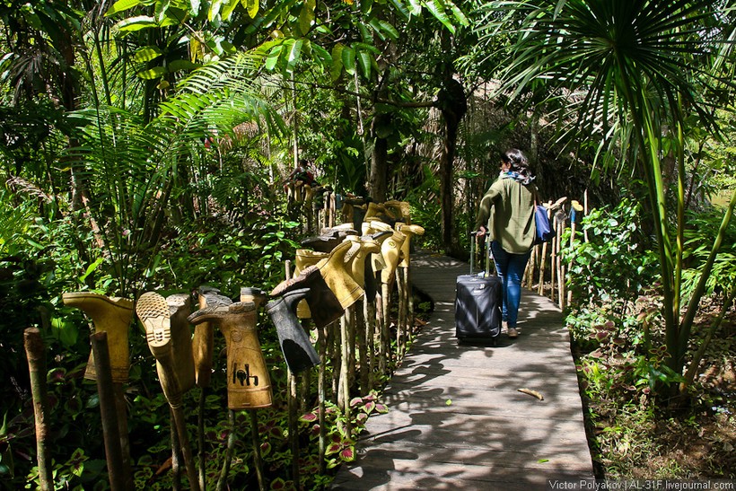 Короче, выглядит это так: крыша из пальмовых листьев, вход-занавеска из пальмовых листьев, деревянный пол. На четырех деревянных чурках посреди комнаты стоит матрас, вокруг которого натянута сетка от комаров. Рядом еще одна стилизованная табуретка, на которой можно вечером зажечь свечу. Стены напротив входа нету вообще — там джунгли.