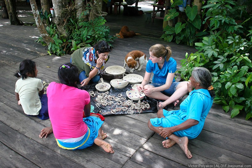 Когда завозят свежих туристов, в лагерь приплывают индейцы и продают свои бусы-браслеты. Все сделано из того, что дают джунгли — никакой синтетики, ну и цены ниже, чем в городе.