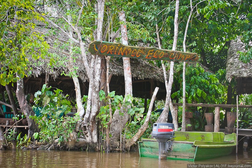 Итак, на развилке, вернее на слиянии двух рек, посреди болота обнаружился причал. Это наш дом на ближайшие три дня — «Ориноко Эко Кэмп».