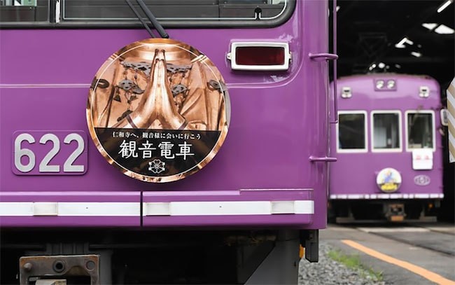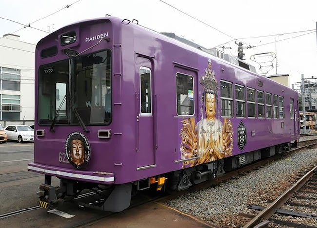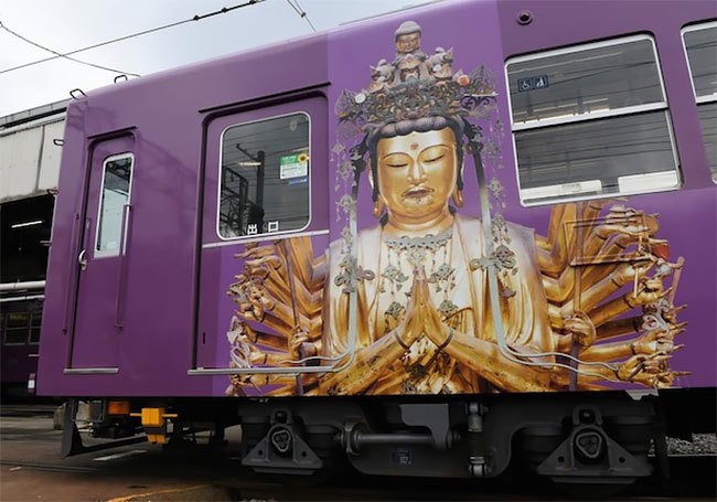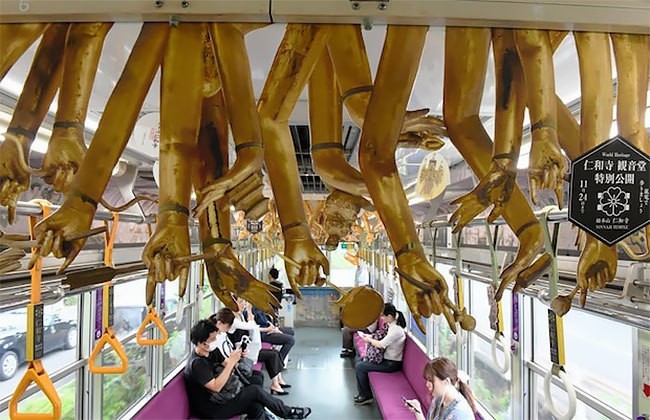 Теперь по туристическим точкам живописного японского города Киото путешественники могут прокатиться на весьма экзотическом поезде, декорированном конечностями тысячерукой богини Каннон.