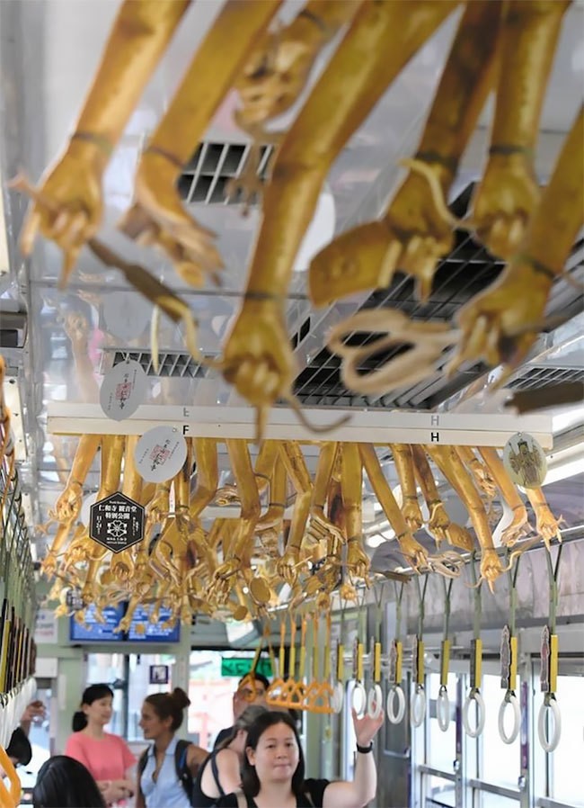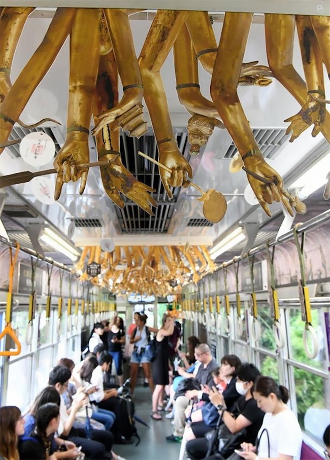 Около восьми десятков золотых рук в различных позах разместили прямо над головами пассажиров. Скульптуры мгновенно отсылают осведомленных в буддийский вероучениях и мифах Японии к богине Каннон. Такой уникальный поезд курсирует по линии Китано на электрической железной дороге Кейфуку.