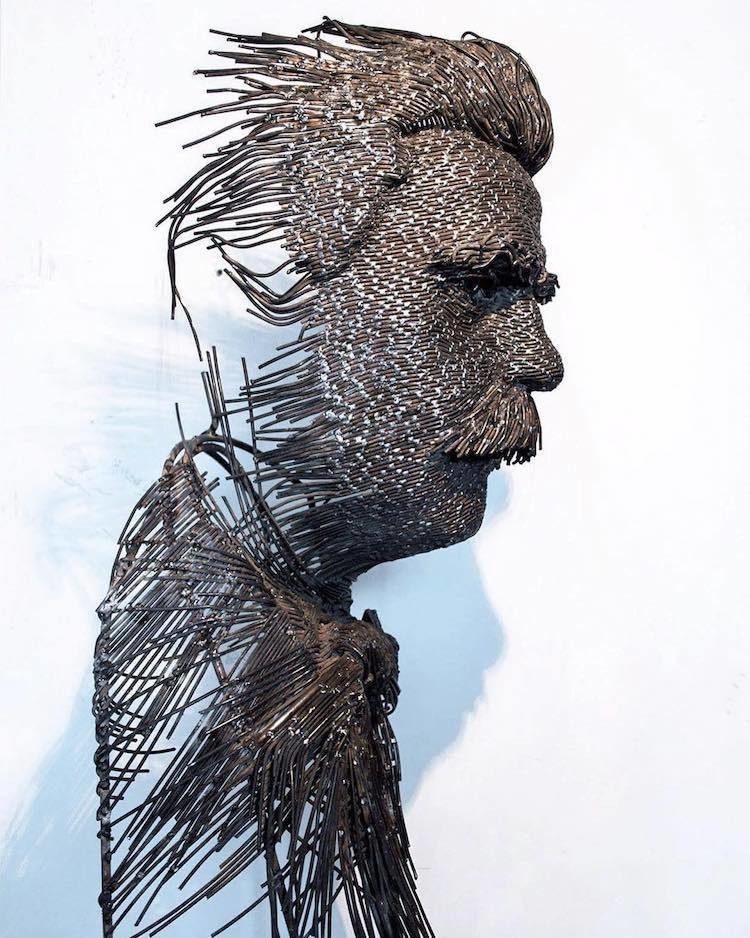 Дариус Хулеа, скульптор из Румынии, который с огромным мастерством и креативностью соединяет современное и классическое, используя в своем творчестве нержавеющую железную, латунную и медную проволоку. С помощью эти промышленных материалов художник «рисует» в трех измерениях, аккуратно формируя узнаваемые портреты из металлов. Дариус дарит новую жизнь и переосмысление великим интеллектуалам и деятелям прошлого.