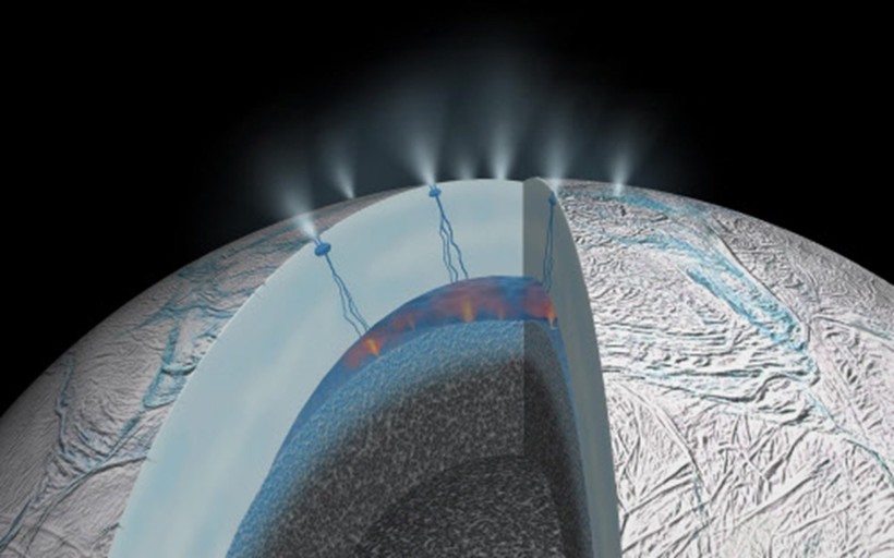 Ледяная внешность Энцелада обманчива. Под холодной оболочкой скрывается целый океан воды, который поддерживается в жидком состоянии благодаря высокой тектонической активности в недрах небесного тела. Достоверно известно, что в южной части спутника располагается обширный подледный океан с водой. Сквозь имеющиеся трещины периодически осуществляется выброс внутреннего содержимого, а извержения и фонтаны гейзеров были неоднократно зафиксированы при помощи исследовательских зондов. Наличие воды в жидком ее состоянии предполагает уже более комфортные для жизни условия, а это означает, что под ледяной оболочной могут находиться области, вполне пригодные для жизни небольших микроорганизмов. Согласно данным моделирования, температура под ледяной поверхностью может составлять около 0ºС, а вблизи источников тепла значительно превышать этот показатель.