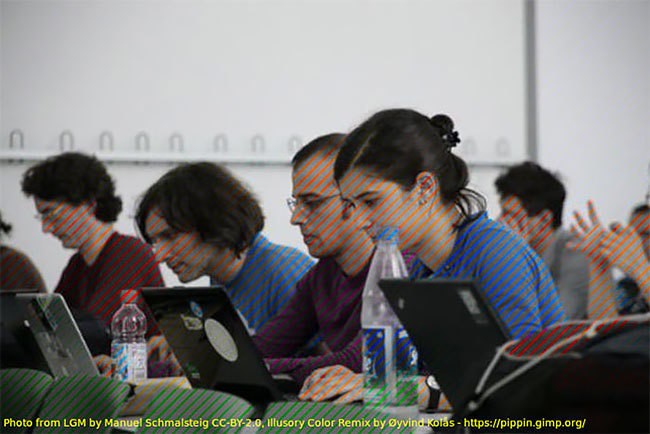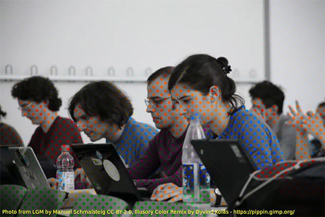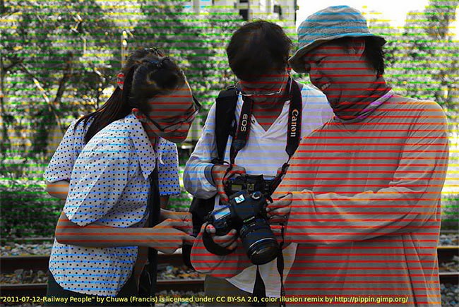 Изображение, созданное диджитал-художником и разработчиком программного обеспечения Эйвиндом Колосом, заставляет ваш разум дополнять увиденное, задействуя цветные линии в качестве подсказок, помогающих предсказать, как должна выглядеть остальная часть картинки. Эйвинд называет этот эксперимент «цветовой ассимиляцией сетчатой иллюзии». На самом деле это просто пересечение цветных линий, наложенное на черно-белые снимки.