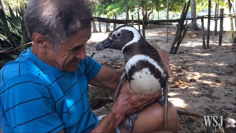 Все мы знаем, насколько верно служат нам братья наши меньшие — собаки. Преодолевая огромные расстояния, они находят свой дом и любимого хозяина. Но, оказывается, не менее преданными могут быть и пингвины. Бразилец Жуан Перейра де Соуза нашел на скалах истощенного детеныша пингвина, перепачканного нефтью. Животное было обречено погибнуть, но мужчина принес его домой, отмыл и принялся усиленно его выхаживать и кормить. Вскоре птица пошла на поправку, а когда окончательно пришла в себя, то житель Рио-де-Жанейро отпустил ее на волю. Вот только та уходить не спешила и провела рядом с ним еще почти год. Впоследствии, сменив оперение, пингвин, получивший имя Диндим, исчез, но уже через несколько месяцев вновь вернулся к своему спасителю. Встреча произошла случайно на пляже, и тогда гость снова остался пожить с человеком. С 2011 года благодарное животное приплывает к 71-летнему Жуану и проводит с ним время с июня до февраля. Бразилец говорит, что с каждым разом пингвин все ласковее и радостнее встречает его. В видеоролике видно, как животное действительно ластится к мужчине и ходит за ним по пятам. Питомец дает брать себя на руки и отвечает на любовь полной взаимностью.