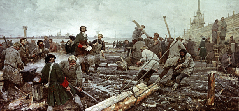 Легенда гласит, что Петр Великий со всех губерний страны пригнал тысячи крестьян на строительство Санкт-Петербурга. Они плохо питались, страдали от влаги и мороза, погибали на болотах. Именно поэтому считается, что Петербург построен на крестьянских костях. Действительно, строительные работы выполняли крестьяне. По состоянию на 1704 г. в Санкт-Петербург было вызвано 40 тыс. рабочих, в основном государственных или крепостных.