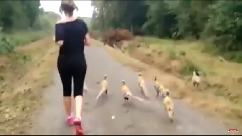 Утренняя пробежка героини этого видео превратилась в сцену из фильма: она пытается убежать от фазанов-преследователей.