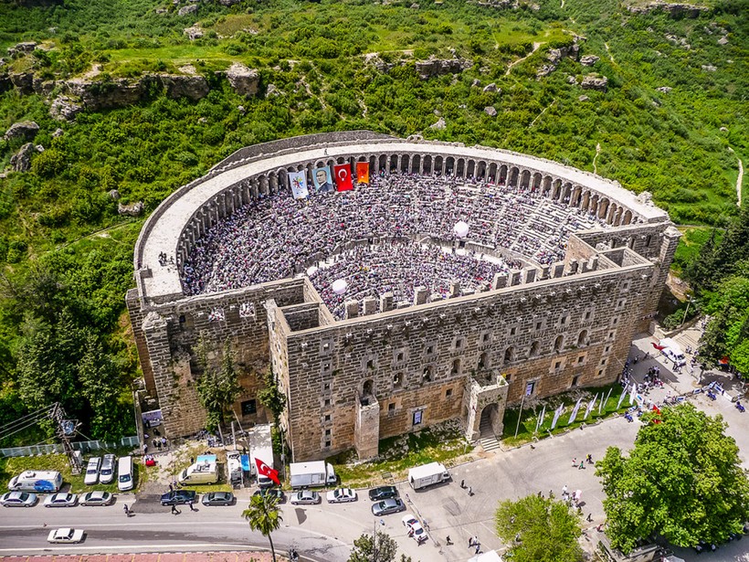 Римский театр Аспендос впервые описан хеттами в 800 г. до н.э. Амфитеатр, являвшийся когда-то частью города Аспендос, вмещал до 15 000 человек. Сегодня здесь проводится ежегодный Международный фестиваль оперы и балета в Аспендосе.