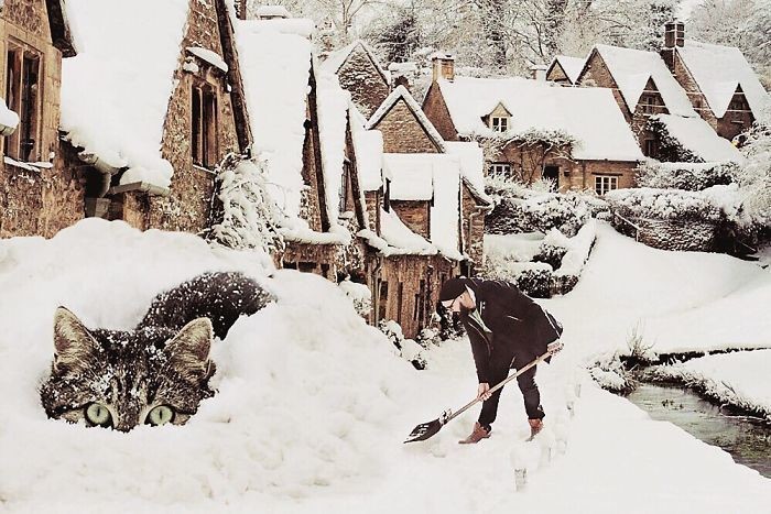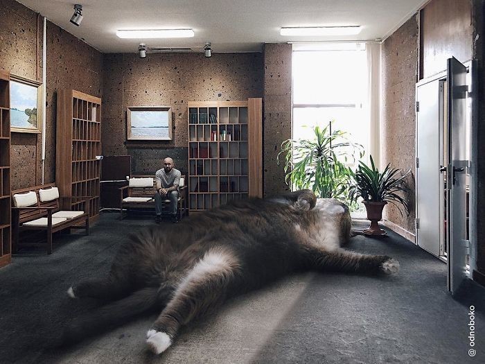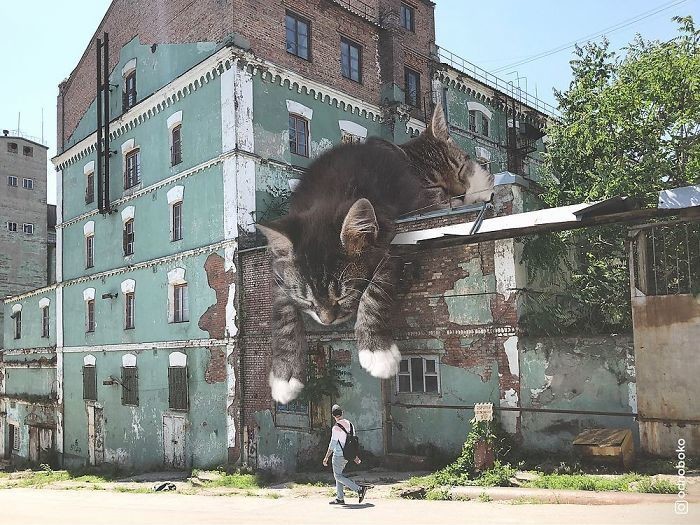 Вы когда-нибудь представляли, как замечательно было бы жить в мире с гигантскими котиками? Только вообразите, как вы гладите трехметрового мурлыкающего кота, пушистого и дружелюбного — разве это не самая потрясающая антистресс-мечта?! Впрочем, такая очаровательная фантазия не наша заслуга, это работа российского художника Андрея Щербакова. Не так давно талантливый парень из Ростова-на-Дону разместил в сети больше сотни своих изумительных изображений, которые способны растопить сердце любого кошатника.