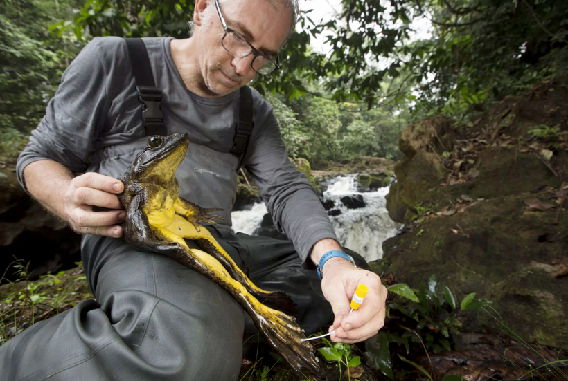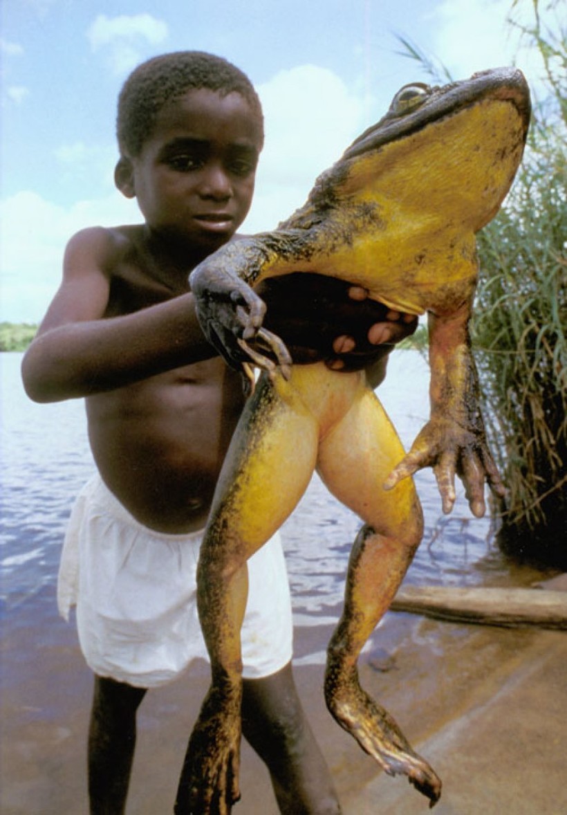 Лягушки-голиафы не зря получили такое имя — они действительно огромны. Размеры взрослой особи достигают 34 сантиметров при весе в 3,3 килограмма, что делает их самыми крупными на планете среди сородичей. Обитают эти гигантские амфибии лишь в одном единственном месте на Земле — в экваториальной Африке, в лесном массиве на юго-западе Камеруна, а также в пограничных с ним регионах Экваториальной Гвинеи. Здесь влажно, а главное — очень тепло: в лесу круглый год держится ровная высокая температура, что как раз необходимо для развития потомства этих огромных лягушек. Кроме того, здесь есть так необходимые им реки, с быстрым течением, вода в которых насыщена кислородом. Интересно, что этот вид лягушек предпочитает не стоячие озера и болота, а именно реки. Но, несмотря на свою пугливость и осторожность, этот вид часто становится добычей браконьеров и местного населения, которое употребляет лягушек-голиафов в пищу. Из-за интенсивной охоты численность огромных земноводных упала до критических отметок, и вид был внесен в Красную книгу.