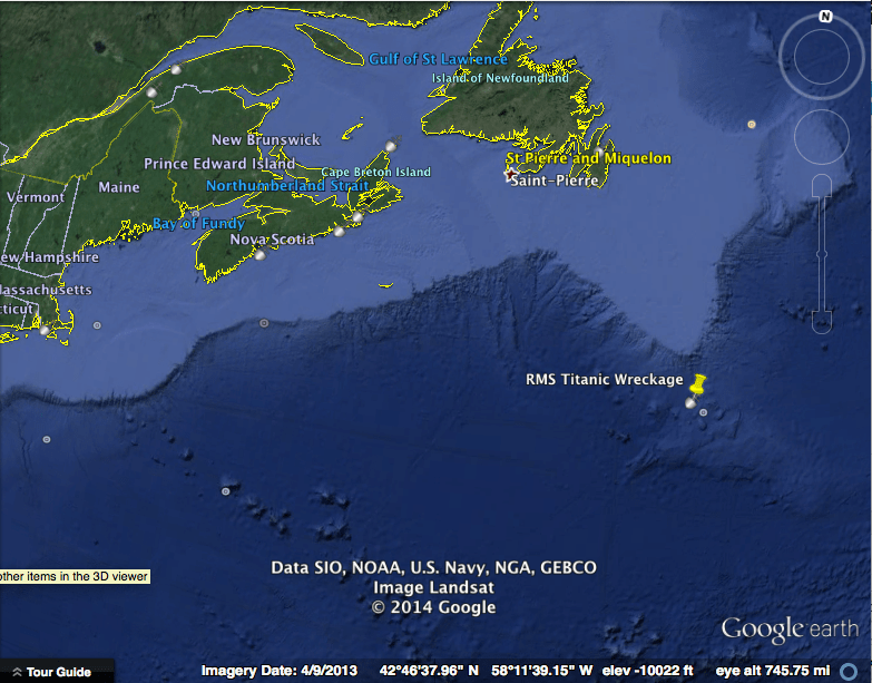 Британский пассажирский лайнер «Титаник» затонул в Северной Атлантике рано утром 15 апреля 1912 года. Это произошло после встречи с айсбергом во время его первого рейса в Нью-Йорк из Саутгемптона, Великобритания. В то утро погибли более 1 500 пассажиров. Крушение Титаника — седьмое по величине морское бедствие в истории человечества. Приведенные выше координаты являются последним местом нахождения корабля. Обломки покоятся на морском дне на глубине 12 000 футов.