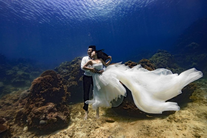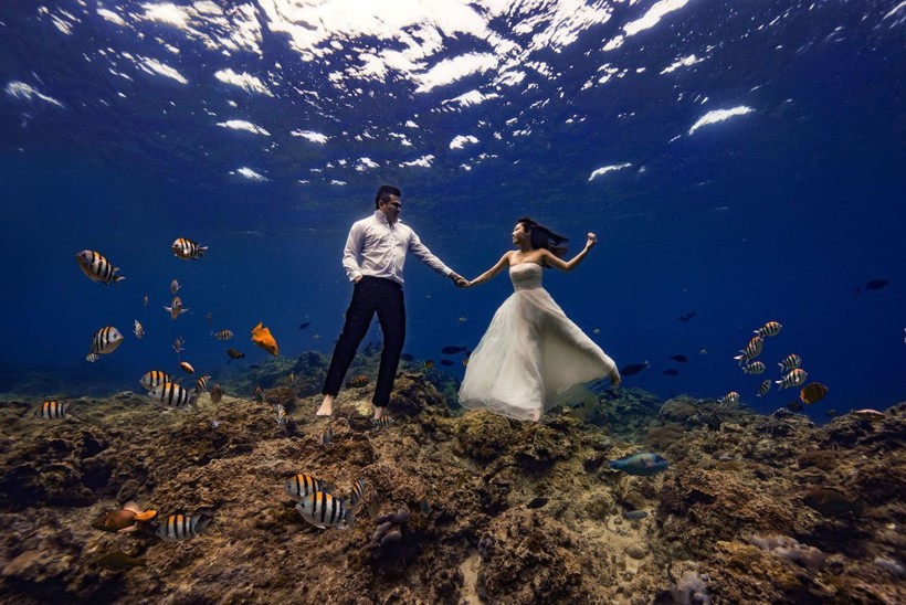 Сначала все началось как обычно: несколько прекрасных кадров на берегу моря. Ну а затем молодожены погрузились под воду прямо в нарядах: роскошном свадебном платье и элегантном костюме. Они держались за руки, обнимались и целовались — и все это под водой. Влюбленные получились невероятно эффектно: они словно парят над морским миром и его обитателями. Дэниэл рассказал, что готовился к фотосессии почти два года, и она получилась даже лучше, чем он предполагал.