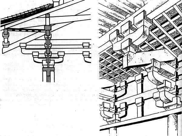 Для поддержания столь сложной крыши китайские архитекторы изобрели совершенно уникальную, нигде более не встречающуюся систему крепления кровли. Здесь нет традиционной для многих архитектурных стилей системы стропил, вместо нее применяется весьма сложная стоечно-балочная конструкция с многоярусными кронштейнами под названием «доу гун». Посмотрите, как выглядят традиционные опоры для китайских крыш.