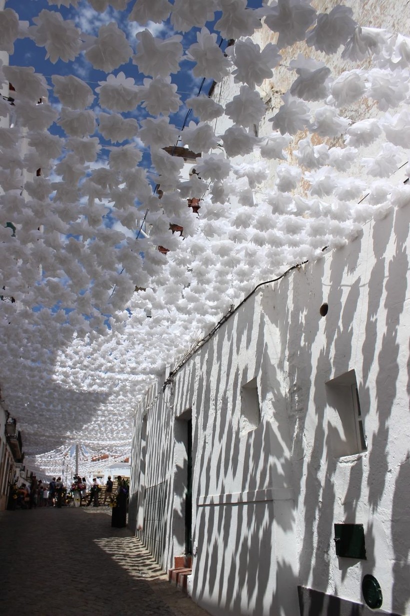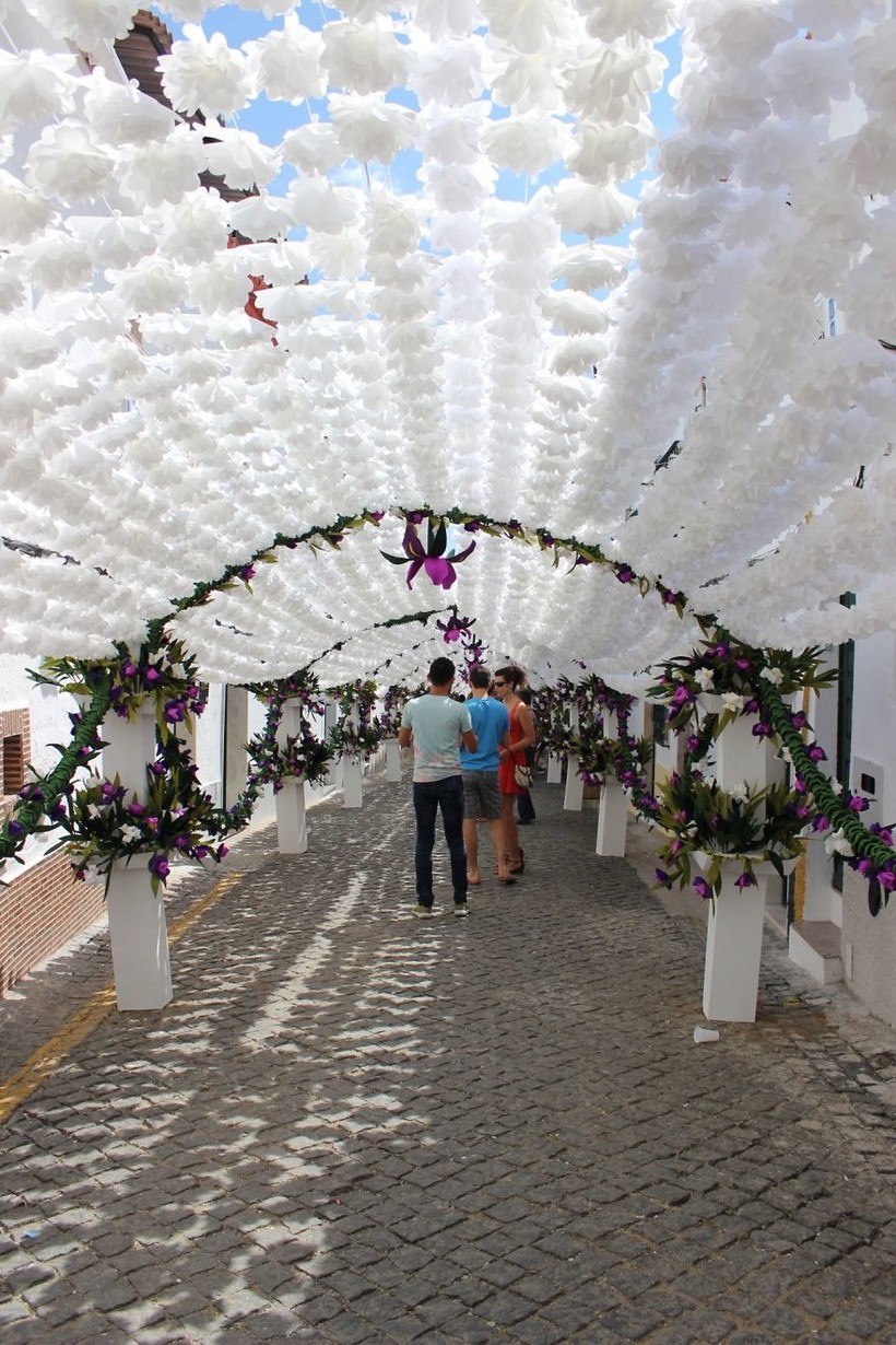 На этот раз жителям города пришлось трудиться над этим шедевром около 4 месяцев. Поднимая глаза в небо, вы видите бесчисленные прекрасные бумажные цветы — результат скрупулезной, терпеливой и тонкой работы целых семей, которые проводили бессонные ночи, стараясь сделать город уникальным. И вся эта блистательная красота располагается в самом сердце Алентежу, крупнейшей португальской области.