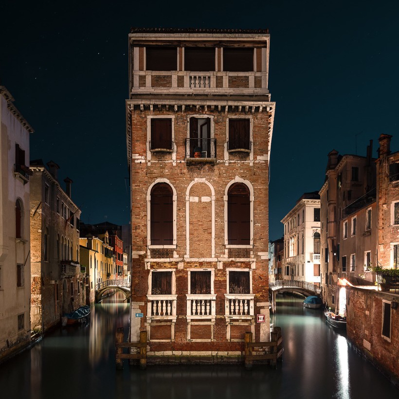 В его коллекции Sleeping Venice безмятежная гладь каналов становится зеркалом для залитых светом фонарей доков и обветренных стен кирпичных зданий в теплых тонах. Пуарье говорит, что сначала находил места пересечения венецианских мостов и каналов с помощью Google Maps, а затем отправлялся туда на пешие прогулки. Несмотря на то, что в работах Тибо много воды, все фотографии он сделал, находясь на суше — с земли, мостов и тупиковых улочек.