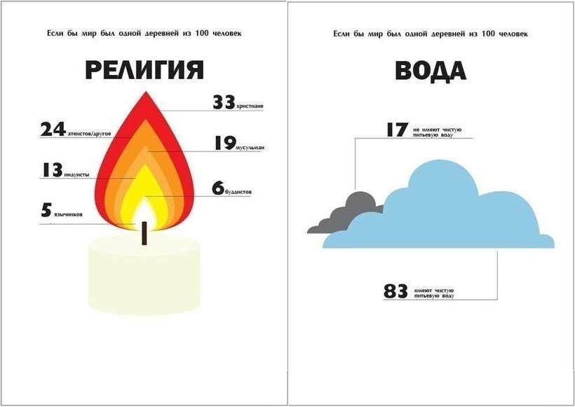 Мы редко задумываемся о том, сколько разных религий существует в мире, а меж тем жителям нашего городка пришлось бы построить церкви и храмы для каждой из них. Разнообразие прихожан тогда выглядело бы так: 33 христианина, 19 мусульман, 13 индуистов, шестеро были бы буддистами, пятеро — язычниками, оставшиеся 24 были бы атеистами или придерживались иных верований. Из всех жителей только 83 человека смогли бы пить чистую воду, 17 не имели бы такой возможности.