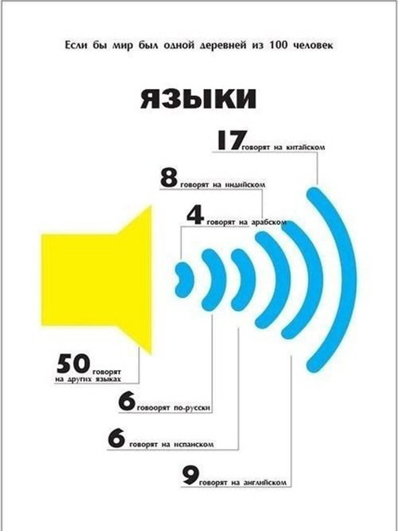 Все соседи в этом поселении разговаривали бы на разных языках: 6 говорили бы на русском, 9 — на английском, 17 — на китайском, 8 — на хинди, шестеро — на испанском, четверо — на арабском, остальные — на прочих.