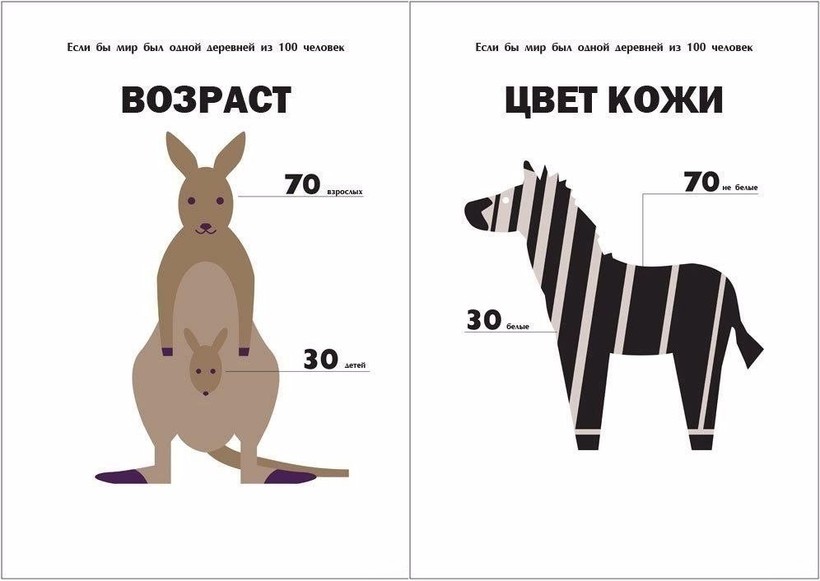 Получается, что из этого числа 70 человек были бы взрослыми, а 30 — детьми. Белый цвет кожи имели бы всего 30 людей, остальные же были бы темнокожими.
