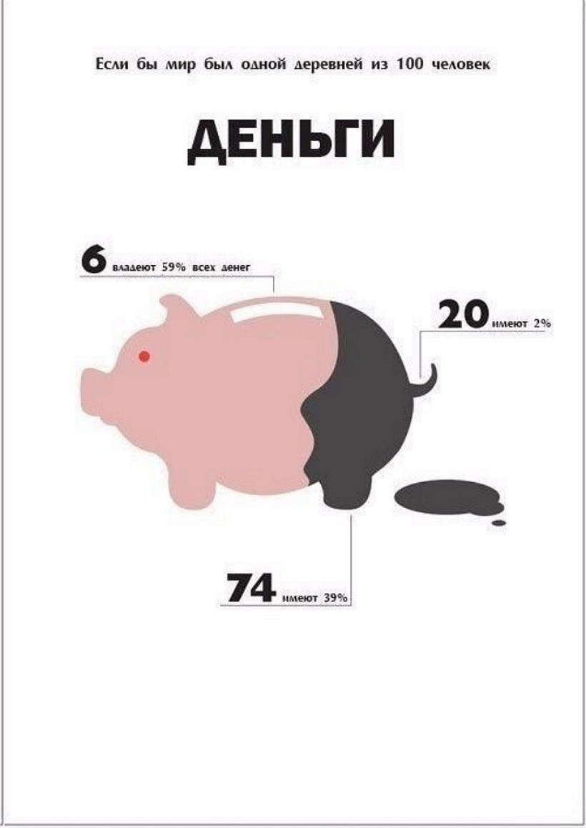 Богатство у этих людей распределилось бы следующим образом: 6 богачей владели бы 59% всех денег, 74 человека считались бы людьми среднего достатка и обладали бы 39% денежных ресурсов, остальные 20 человек довольствовались бы только 2%.
