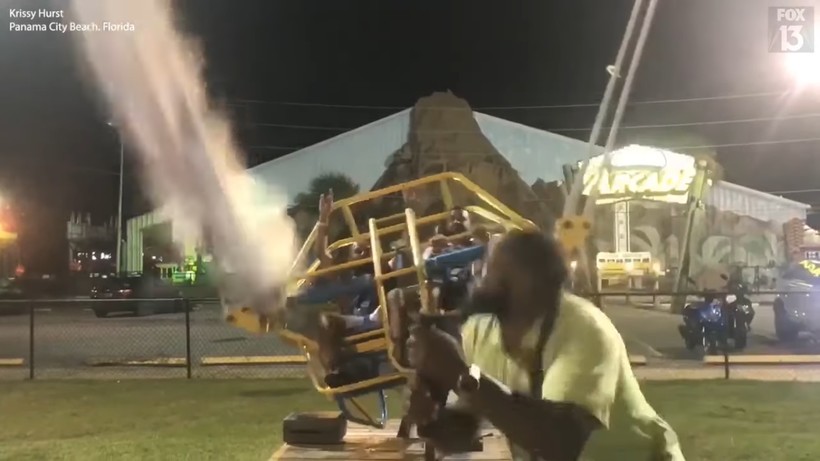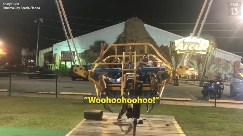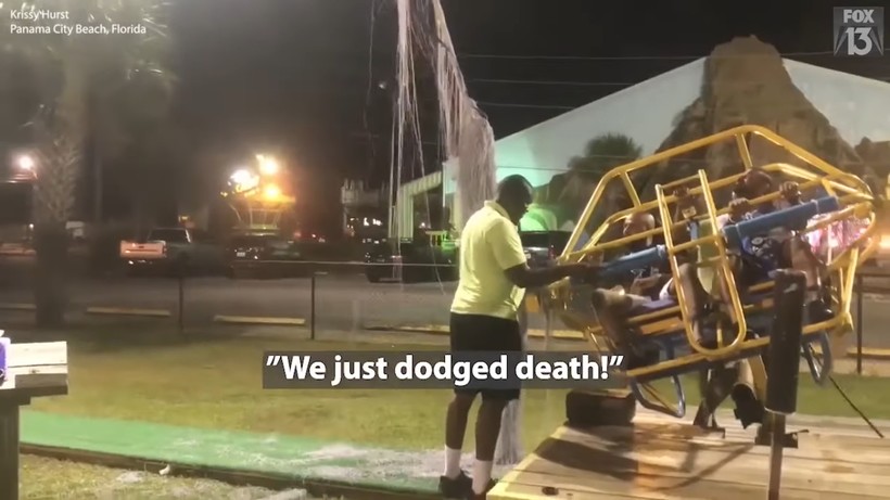 В этом видео люди хотели повеселиться, но прямо перед запуском аттракциона трос лопнул, а мужчины, желавшие прокатиться, точно были рождены под счастливой звездой.