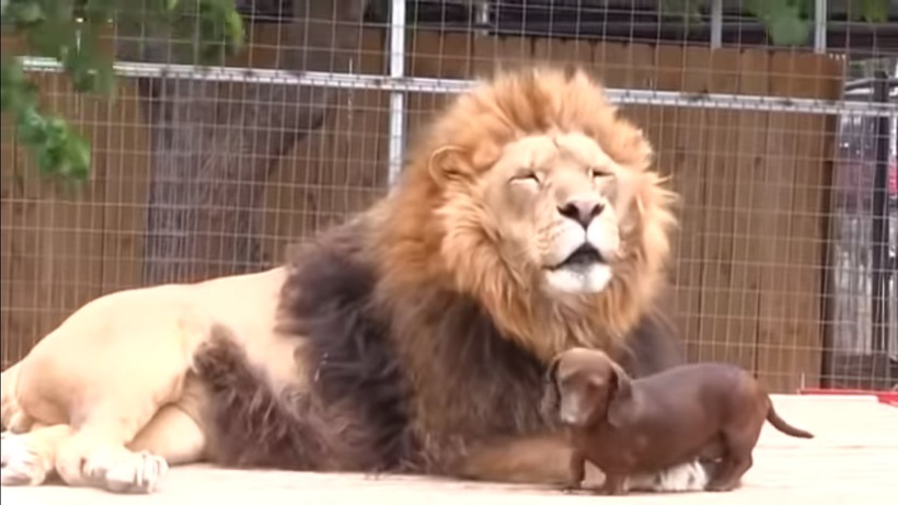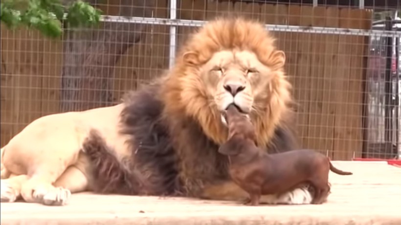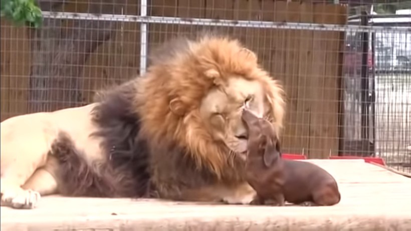 В экзотическом парке животных Большой Виннвуд, расположенном в штате Оклахома (США), нашло свой дом немало исчезающих видов животных. В общей сложности здесь можно встретить свыше 700 живых существ. Именно среди них проживают два удивительных друга, о которых мы хотели бы вам рассказать. Лев Бондиггер и такса Мило по-настоящему дружны уже много лет. Маленький львенок был брошен матерью из-за болезни. Тогда работники местного зоопарка спасли кроху и взяли его под свою опеку. Львенок был помещен в отдельный загон с собакой породы такса, ставшей ему мамой. К воспитанию необычного малыша вскоре подключились еще две таксы, однако теплые чувства он испытывает лишь к одной из них — Мило. Король зверей все свободное время проводит с собакой, они вместе обедают и играют. В видеоролике видно, что проявление нежности и ласки происходят у друзей обоюдно. Огромный 200 килограммовый лев и малюсенькая такса совершенно не стесняются своих чувств. Видимо, для зверей вовсе неважно как друг выглядит внешне.