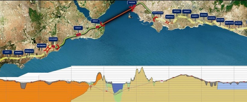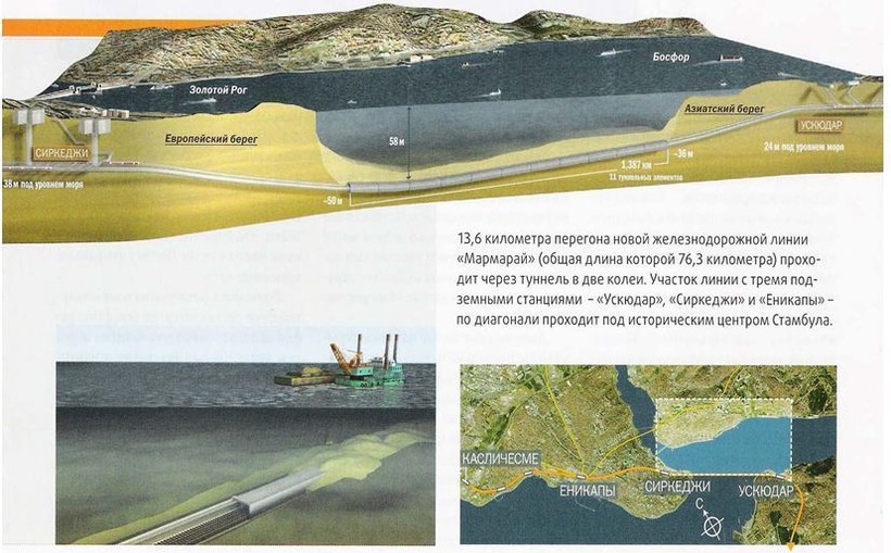В геологическом плане это не самое простое место для строительства. Территория Стамбула расположена в зоне повышенной сейсмической активности, и это обстоятельство пришлось учитывать при проектировании подземного железнодорожного тоннеля. Тоннель был собран из отдельных сейсмоустойчивых секций длиной 130 метров, которые были погружены в грунт залива на глубину в 4,5 метра. Для того, чтобы тоннельные элементы во время погружения не пострадали от давления воды, была применена особо прочная конструкция. Вместе с тем инженерам пришлось принять меры на случай сильного землетрясения. Для устойчивости тоннеля все его секции соединены между собой при помощи сейсмостойких шарниров, которые обеспечивают подвижность во время подземных толчков.