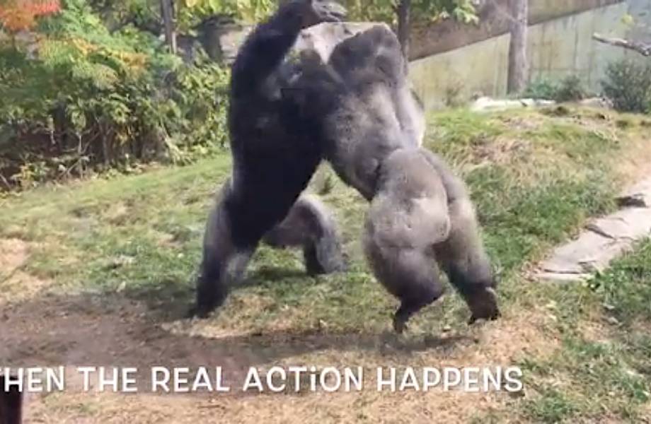 Из-за фильмов образ гориллы всплывает в нашем сознании в виде грозно кричащего самца, бьющего себя в грудь перед нападением. На самом деле это довольно миролюбивые создания, которые дерутся весьма редко. Самки же вступают в сражения намного чаще самцов. В такие перепалки самцы никогда не вмешиваются. Они могут вступить в бой только при условии покушения на лидерство. Обычно такие схватки не приносят увечий и не приводят к смерти, кроме того, они всегда довольно быстро заканчиваются. На видео ниже, записанном в зоопарке посетителями, гориллы напали друг на друга и боролись непродолжительное время. Но зато как же зрелищно и напряженно все выглядело.