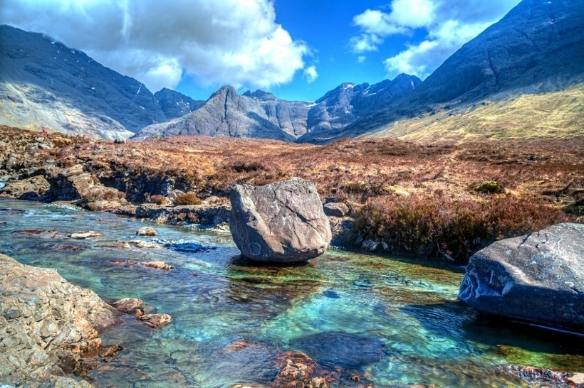 Одно из самых восхитительных мест на острове Скай — Бассейны феи. Потоки кристально чистой воды каскадами стекают со скалистых утесов.