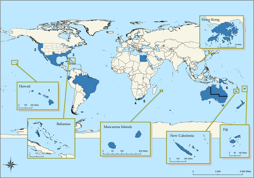 Перейдем непосредственно к местам наиболее частых нападений. Ученые отмечают, что за последнее десятилетие участились случаи нападения акул на пляжах Австралии, Египта, ЮАР и США, хотя минувший 2018 год приятно удивил ученых — было зафиксировано всего 66 нападений. Но при этом стоит отметить, что 32 из них произошли у берегов США, а в 2017 году на пляжах этой страны от нападений пострадали 53 человека. Таким образом, США удерживают первое место по количеству зарегистрированных случаев нападения агрессивных рыб. На втором месте, по данным 2018 года, находится Австралия: на пляжах этой страны пострадали 20 человек. Следом за ними с заметным отставанием идут Таиланд, Бразилия и Египет, где за прошедший год было зафиксировано всего по 3 нападения.