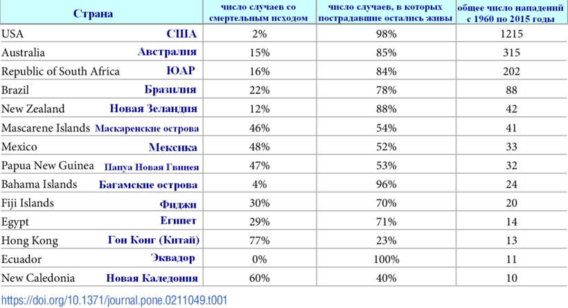 В то же время эксперты отмечают, что количество неприятных встреч с хищниками уменьшилось на побережьях Мексики, Фиджи и Эквадора. Большинство зарегистрированных контактов человека с акулой — это встречи с белой акулой. А о том, где чаще всего встречаются эти крупные морские хищники, можно узнать из нашего предыдущего материала.