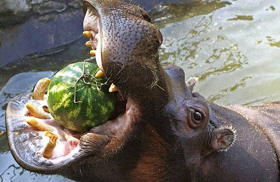 Бегемотов считают самыми мощными травоядными и, кроме того, самыми опасными животными Африки. Бегемоты довольно агрессивны, особенно если дело касается охраны собственной территории и своих детенышей. Известны случаи, когда эти гиганты нападали на небольшие лодки, которые плавали в тех водах, где они обитают. У бегемотов огромная пасть, которая открывается на 180 градусов и может раздавить один арбуз, словно виноградину. В этом видео представлены животные с самыми высокими показателями силы укуса в мире.