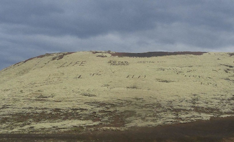 Любители оставлять надписи нашлись и в Исландии. Не пожалев мох на холмах, который теперь будет восстанавливаться долгое время, они исписали достопримечательность шутливыми надписями.