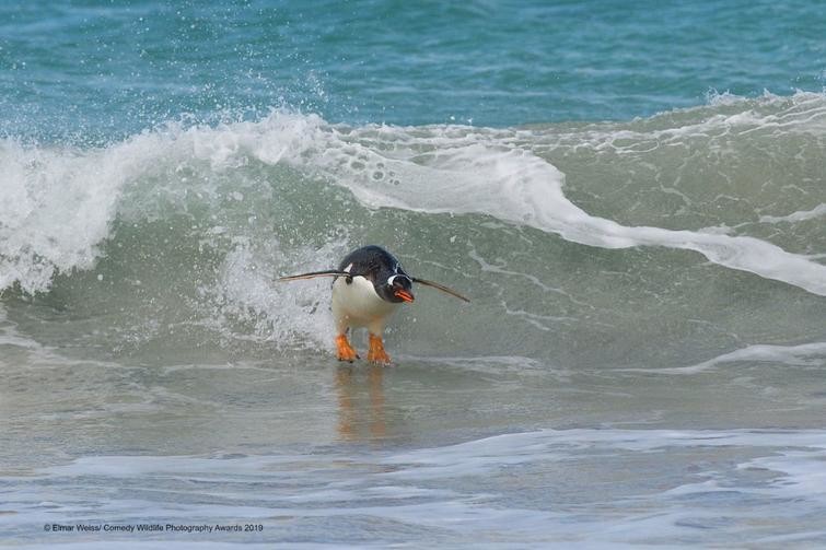 Пингвины так хорошо плавают, что серфинг для них — дело вовсе не опасное и не сложное.