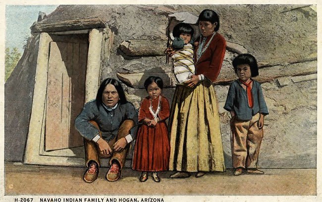 Семья индейцев навахо у хогана, Аризона, 1915