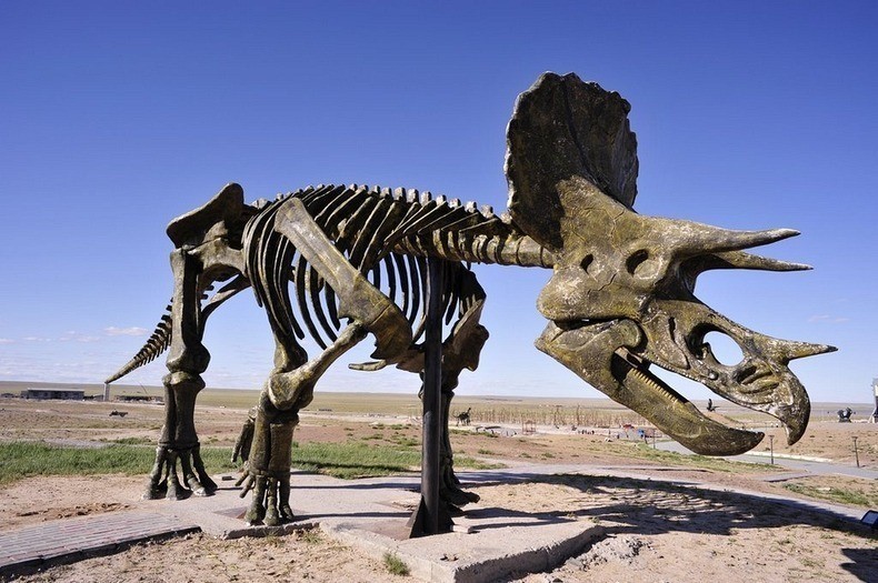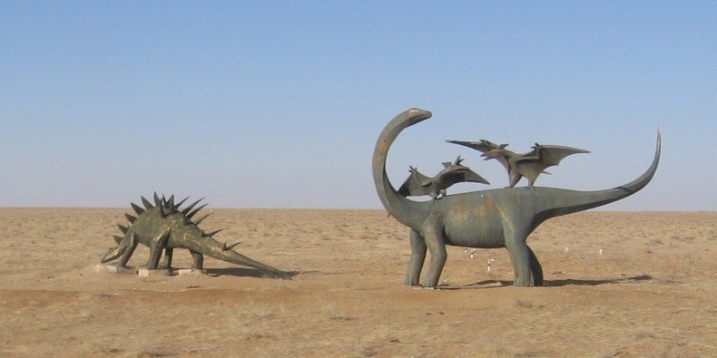 Прошлое этих земель превратили в местную достопримечательность: два гигантских бронтозавра, которые нависли своими шеями над трассой, напоминают о том, кто жил на этих территориях миллионы лет назад. И это не единственные скульптуры: степь здесь усыпана ящерами всех форм и размеров. Они вытесаны из камня, отлиты из металла и сложены из костей.