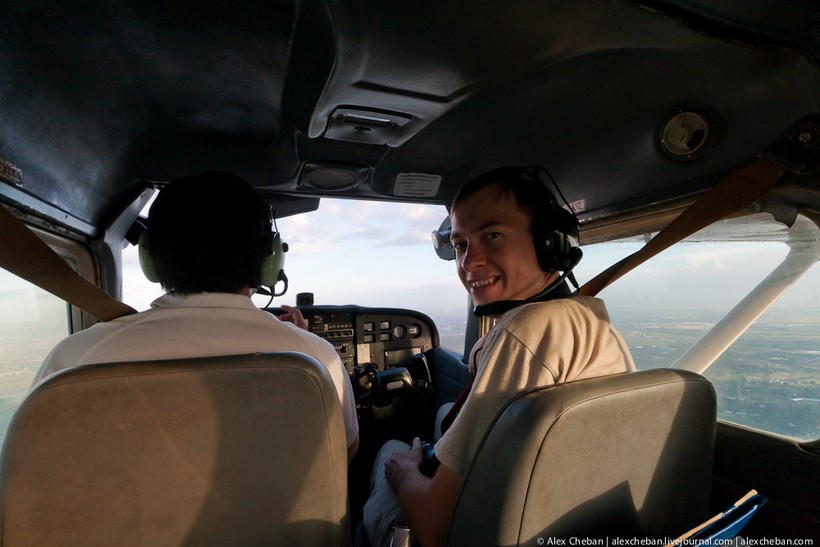 Я летал на четырехместном самолете Cessna-172, он был в тот момент свободен, хотя в этот день туристом был я один. В самолете достаточно шумно, но в плотных наушниках шумоизоляция великолепна и слышно все переговоры с вышкой.