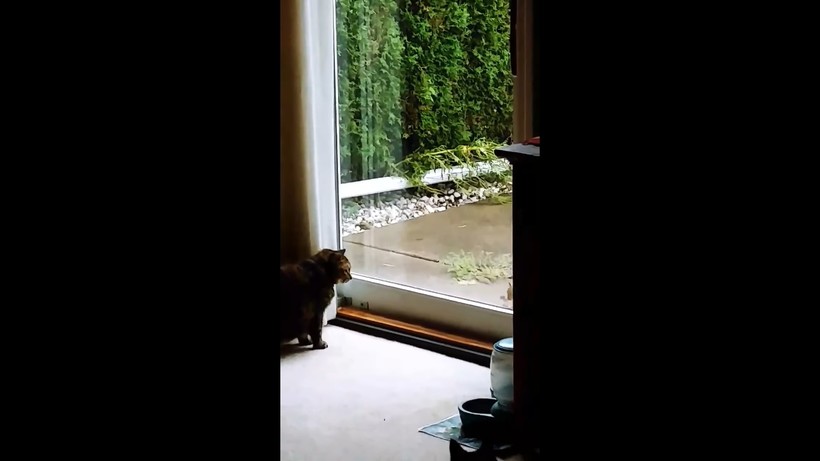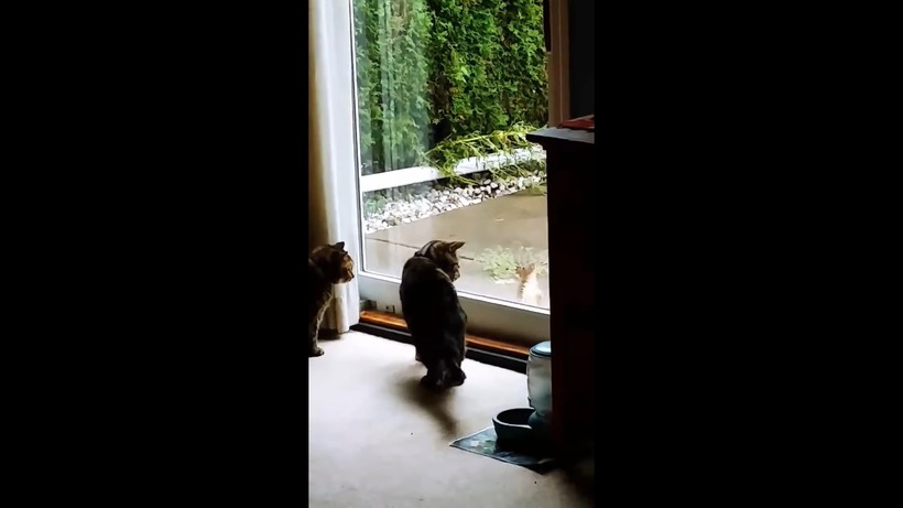 В этом видео кошки с удивлением и вниманием наблюдают за таинственным гостем — белкой, которая дразнит домашних животных, но не понимает, что между ними находится толстое стекло.