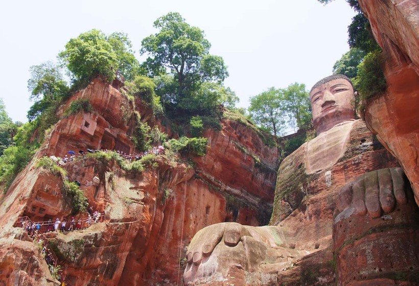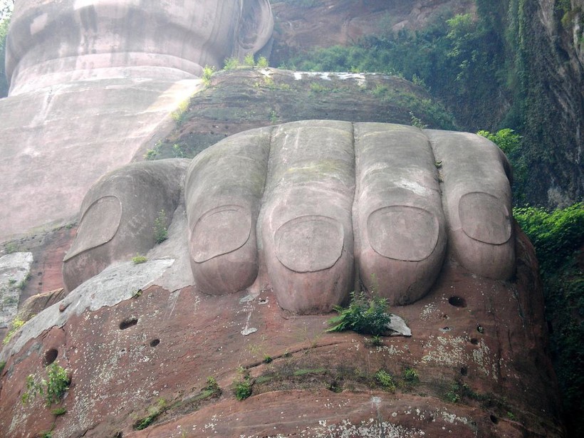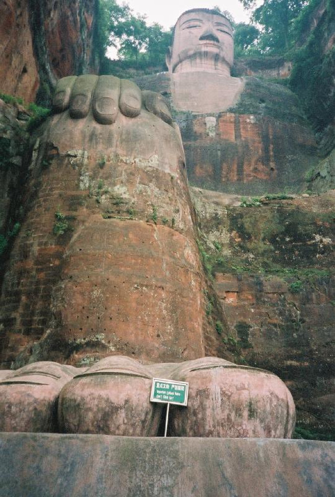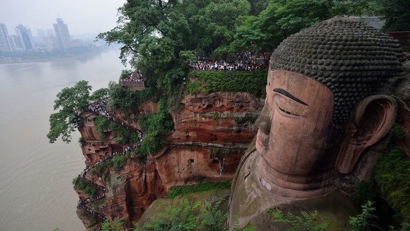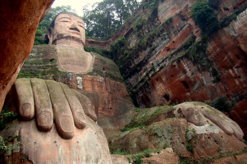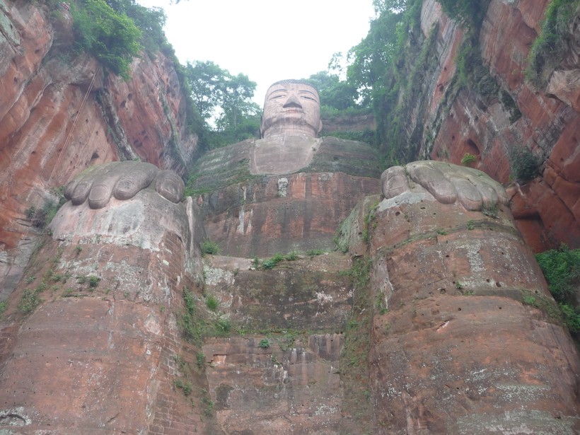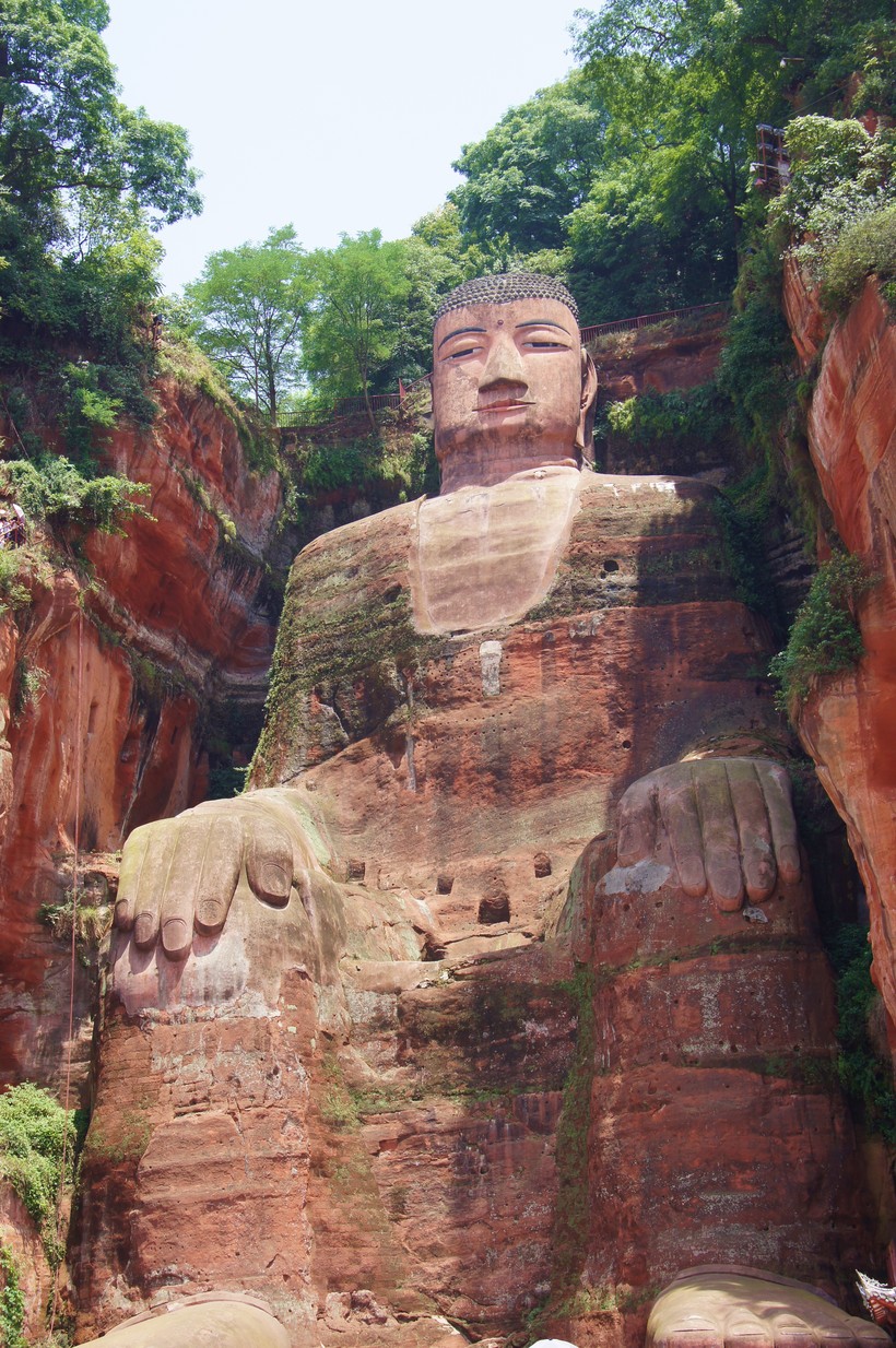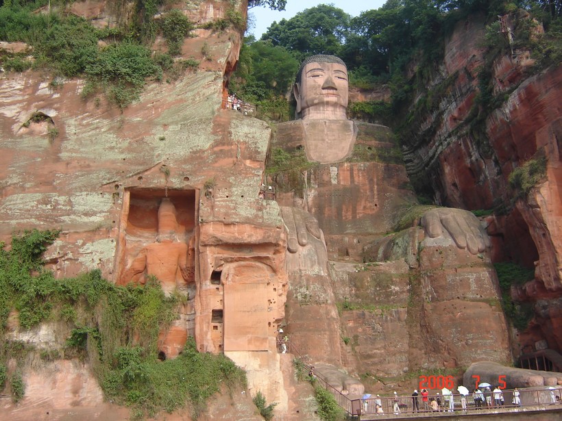 Высеченный в скале Будда смотрит на священную гору Эмэйшань, а его ноги почти омываются водами протекающей рядом реки. Высота его составляет 71 метр, ширина плеч — около 30 метров, длинна носа — более 5 метров.