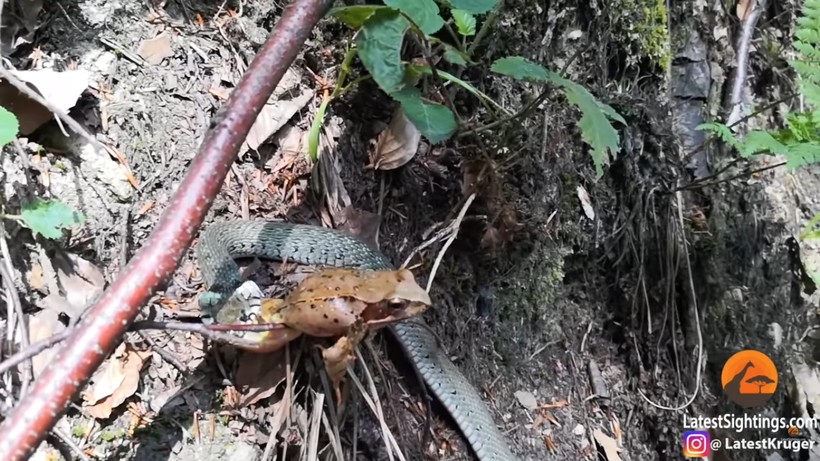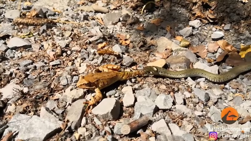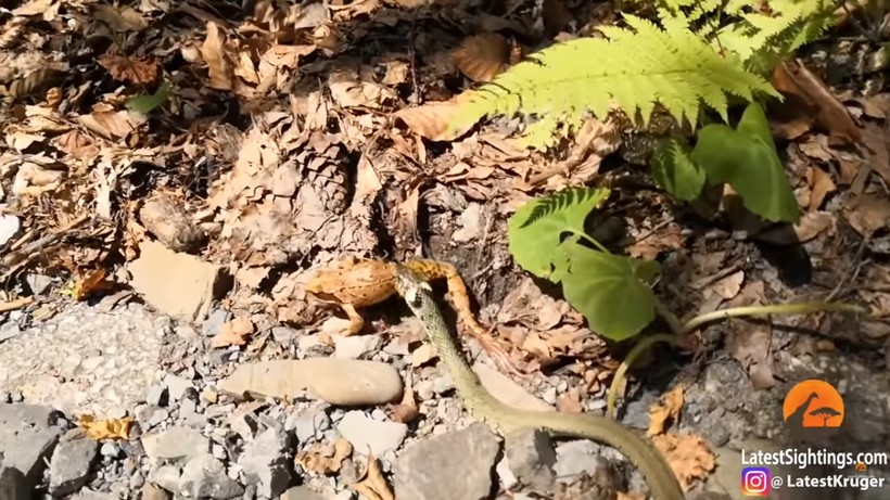 В этом видео лягушка не сдается природе и пытается самостоятельно выбраться из пасти змеи, которая не хочет отпускать свою добычу.
