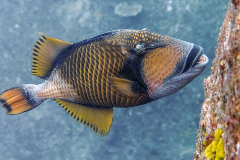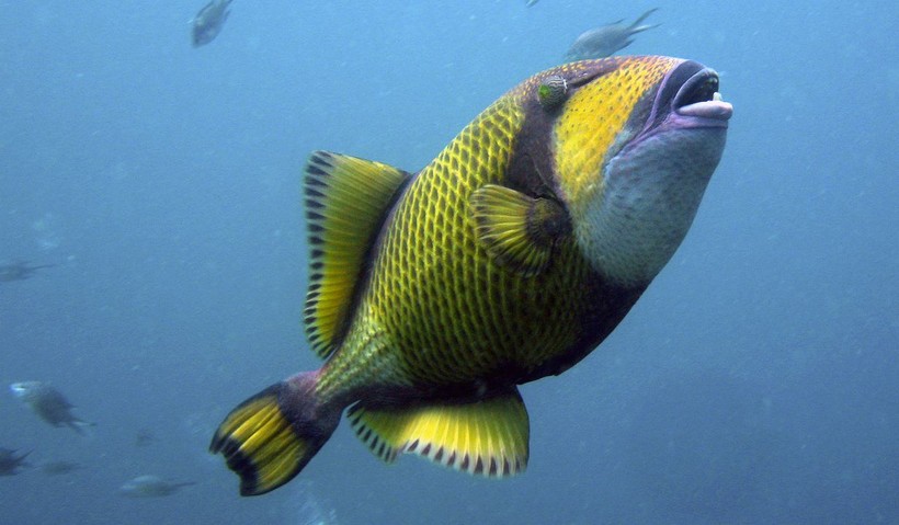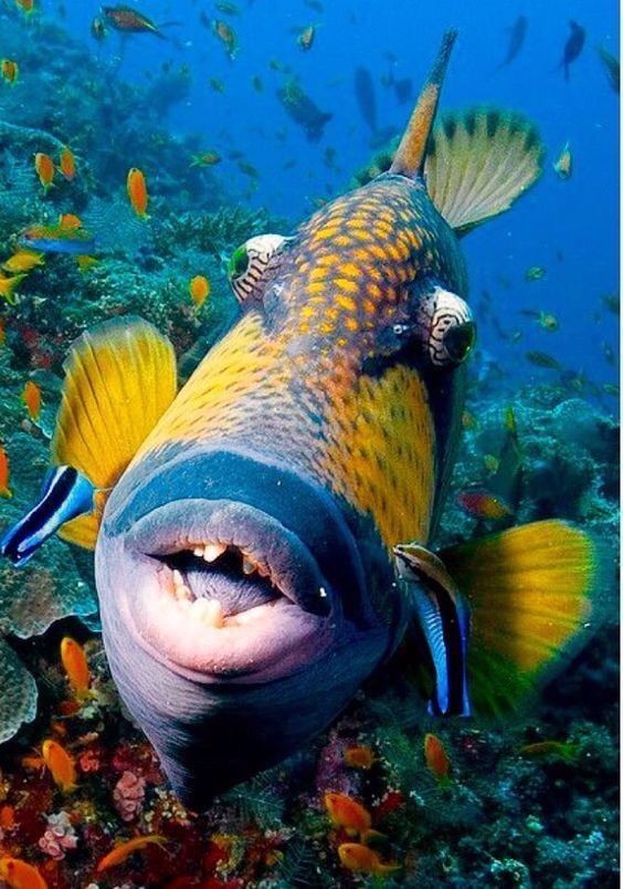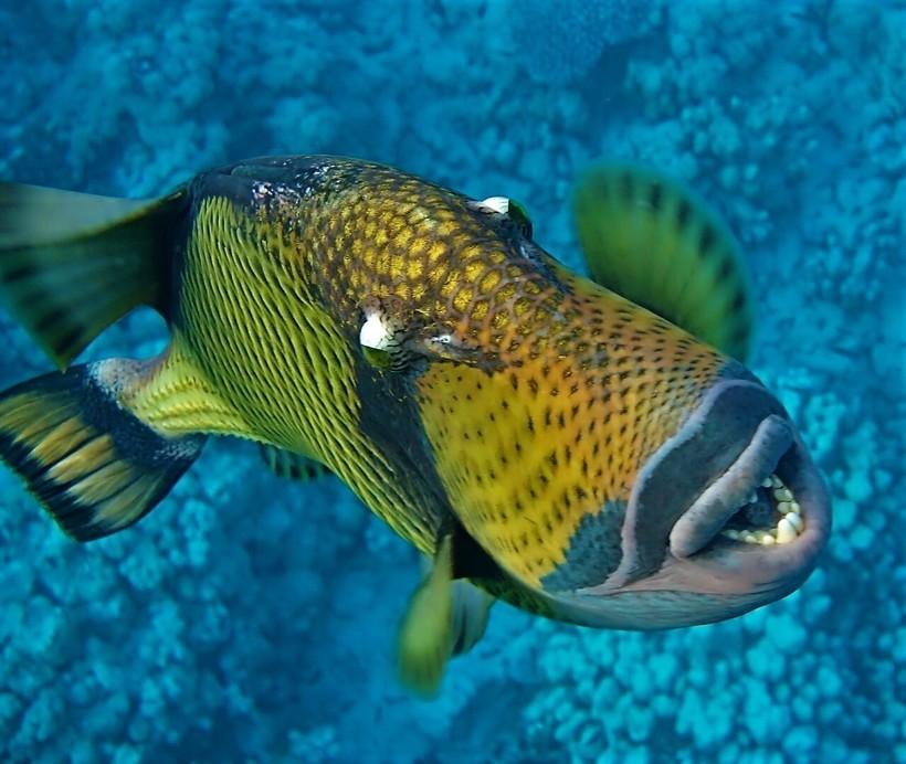 Голубоперые балистоды имеют крупные размеры и ярую внешность. Последнее характерно для большинства обитателей коралловых рифов, но вот крупные и острые зубы выдают в балистодах опасных хищников, и это обстоятельство должно насторожить неопытного дайвера.