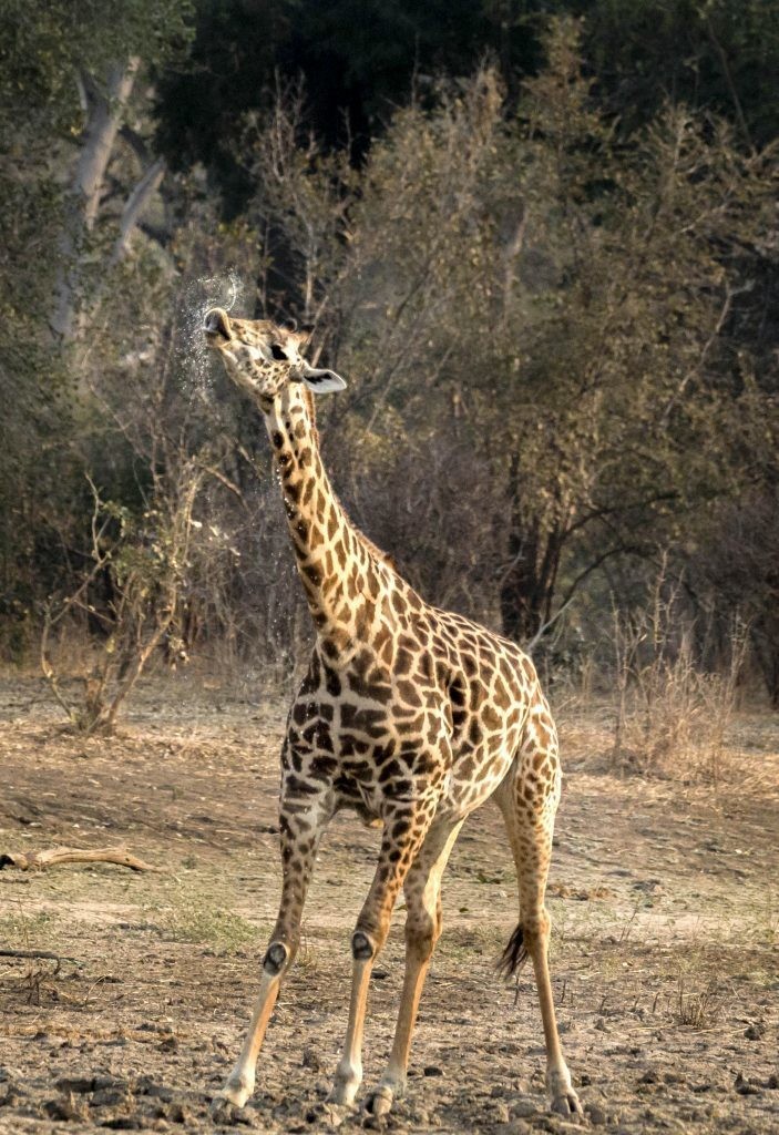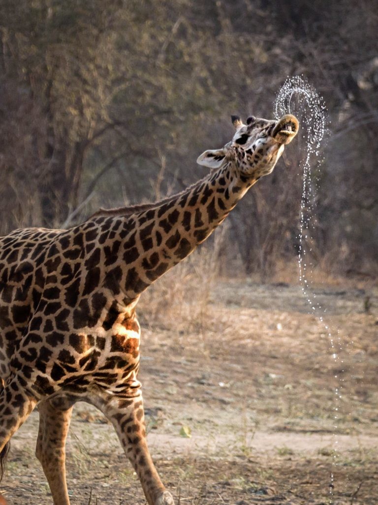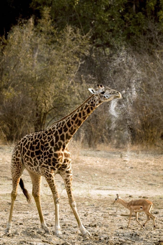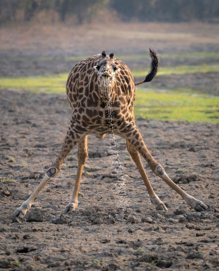 И это не всегда получается с первого раза. В этой позе животные слишком уязвимы, поэтому они не начинают пить, пока не убедятся, что рядом нет хищников. Во время питья жирафы нередко выбрасывают воду в воздух фонтаном и забавно раскатывают язык. Да-да, не так-то просто быть жирафом.