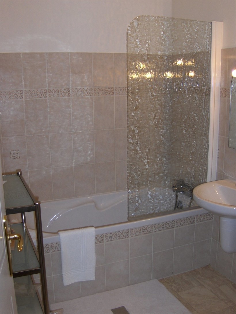 Стандартная занавеска душевой есть в каждом американском номере. В Европе ванна либо не отделена совсем, либо там сделаны пластиковые створки.