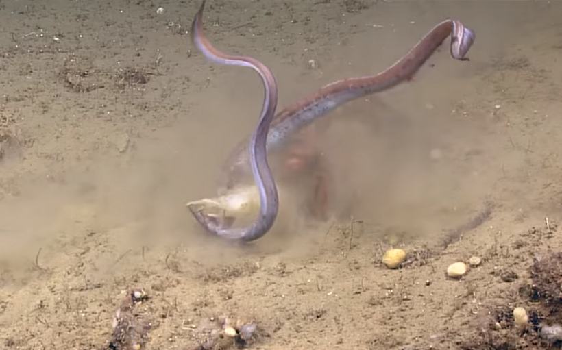 Всем животным, неважно, где они живут — на суше или на море, свойственно отбирать добычу у соседа. В видео, представленном в сегодняшнем материале, угри попытались своровать лакомый кусок у краба, но он так просто не сдался.