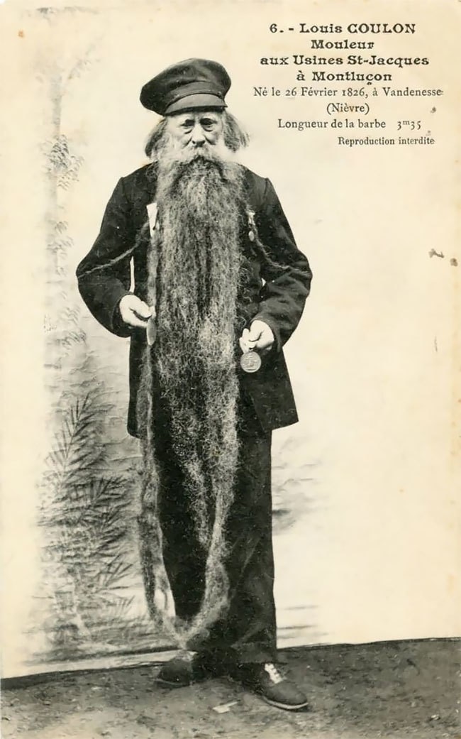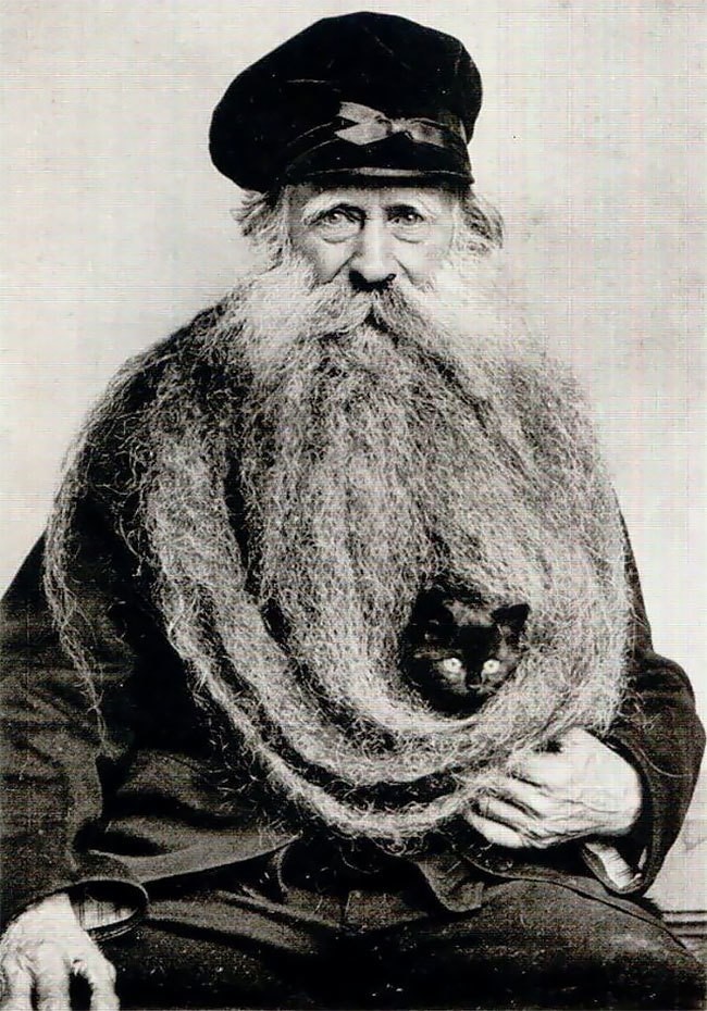 В этой занимательной истории есть и один абсолютно умилительный факт: потрясающую бороду Луи Кулон использовал не только как привлекающую взгляды достопримечательность, но и как убежище для своего маленького пушистого компаньона — кошки. Его образ на фото не был бы столь запоминающимся и уникальным, если бы грубоватая внешность Кулона не дополнялась трогательным видом этого очаровательного создания.