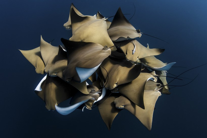 Третьим в этой номинации стал снимок редких восточноафриканских бычерылов у рифа Нингалу в Австралии. Встречу с группой скатов поймал в объектив Алекс Кидд.