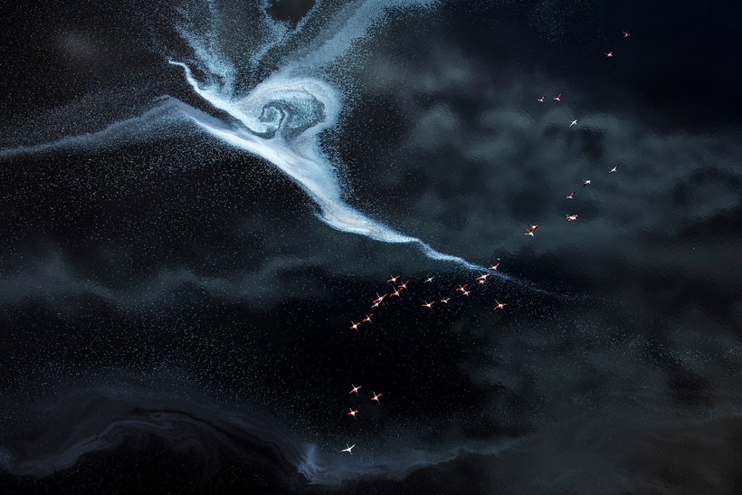 Второе место среди участников этой категории заняла стая фламинго, летящая над озером Магади в Кении. Пена соленой воды образует причудливый узор, по форме напоминающий удар молнии. Фотограф Хао Цзян из США смог сохранить поистине неповторимый момент красоты.