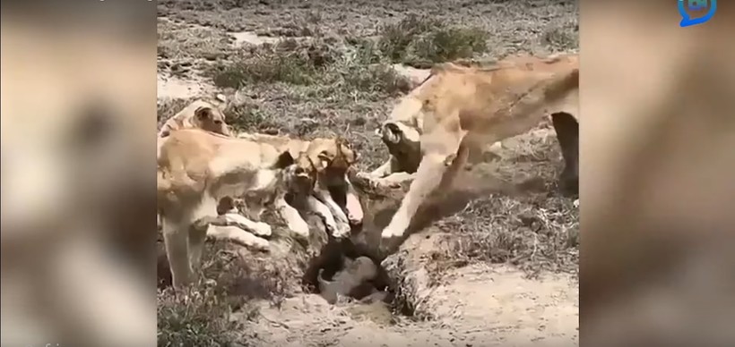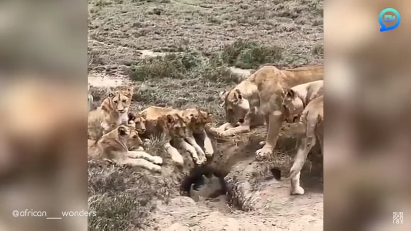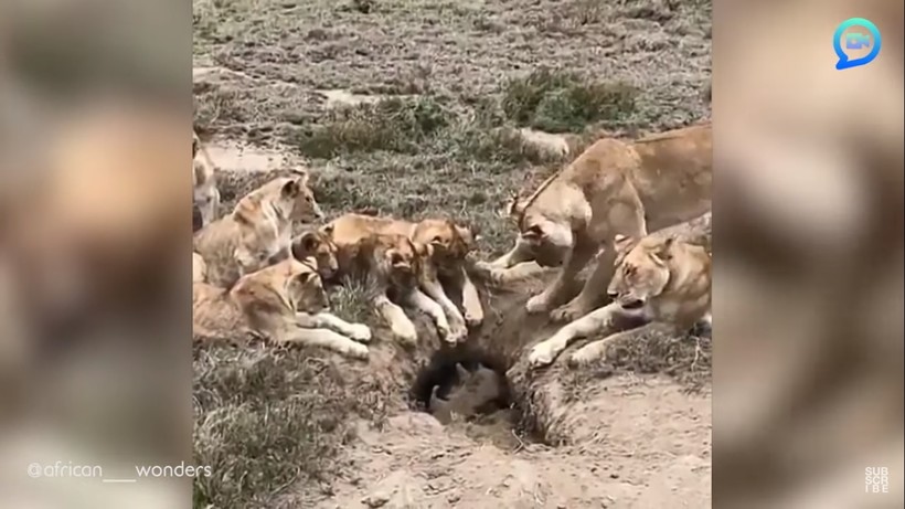 Здесь же водится и такой вид диких свиней, как африканский бородавочник. Этот кабанчик, несмотря на свою всеядность, не может прожить без растительной пищи. На его морде находится пара мощных острых клыков, которыми он прекрасно роет себе для жизни норы. Очень часто можно встретить бородавочника, обосновавшегося не в своей норке, а в вырытом доме других обитателей. В подземное жилище он залезает на коленях, пятясь задом, а спит, высунув морду наружу. Именно в таком состоянии и застала одного из представителей диких кабанов стая львиц, запечатленная автором этого видео. На кадрах видно, что все львиное семейство улеглось вокруг норы бородавочника и ждет, когда он выйдет. Норы диких свиней могут достигать трех метров, поэтому попытки раскопать их своими лапами успеха хищникам не приносит. Бедному бородавочнику, которого спящим застали врасплох, ничего не остается, кроме как прятаться в своем домике и надеяться на чудо.